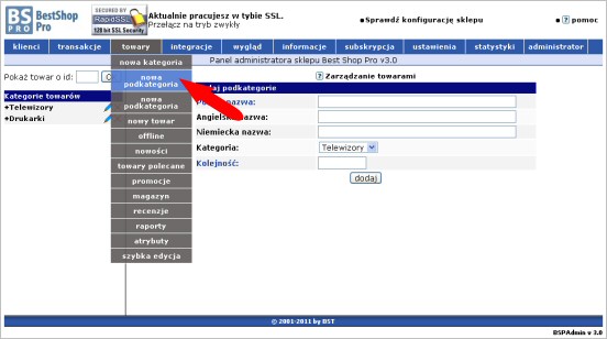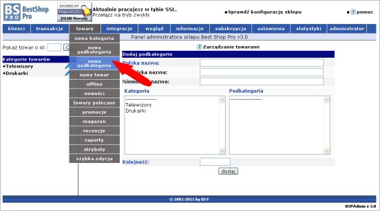 W drugim kroku można dodać do sklepu podkategorie. Podobnie jak to ma miejsce przy dodawaniu kategorii aby dodać podkategorie należy wypełnić formularz dostępny w panelu administracyjnym w dziale Towary - nowa podkategoria.