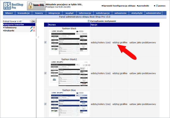 Logo oraz inne elementy graficzne sklepu można zmienić w dziale wygląd - motywy.W pierwszym kroku należy odszukać na liście motywów, ten w którym zamierzamy zmienić logo, a następnie kliknąć w link edytuj grafikę.